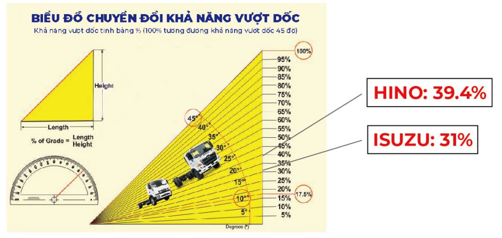 - Khả năng vượt dốc của xe Hino FC lớn hơn Isuzu 8.4%: Xe tải 6.4 tấn HINO FC có thể vượt những đoạn đèo dốc với độ dốc lên đến 23 - 24 độ. Trong khi đó xe Isuzu FRR chỉ có thể vượt dốc tối đa chỉ xấp xỉ 18 - 19 độ.