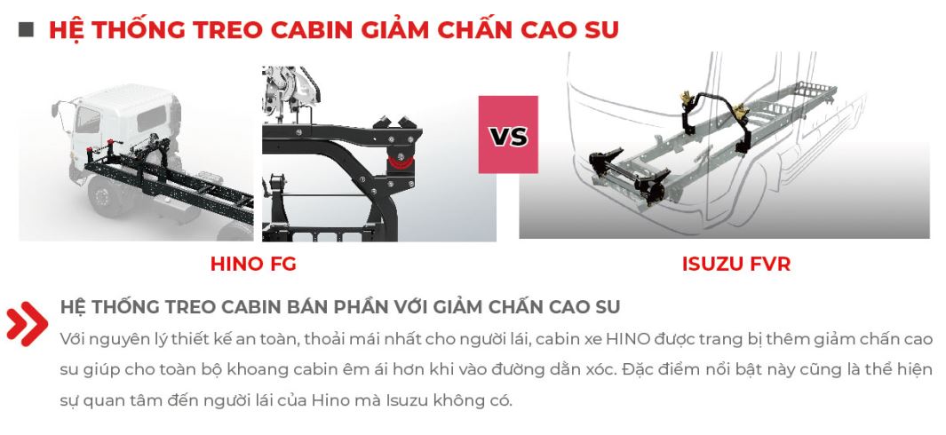 - Hệ thống treo cabin giảm chấn cao su được trang bị trên xe Hino giúp cabin êm ái hơn khi vào đường sóc, giúp tài xe thoải mái hơn khi lái xe