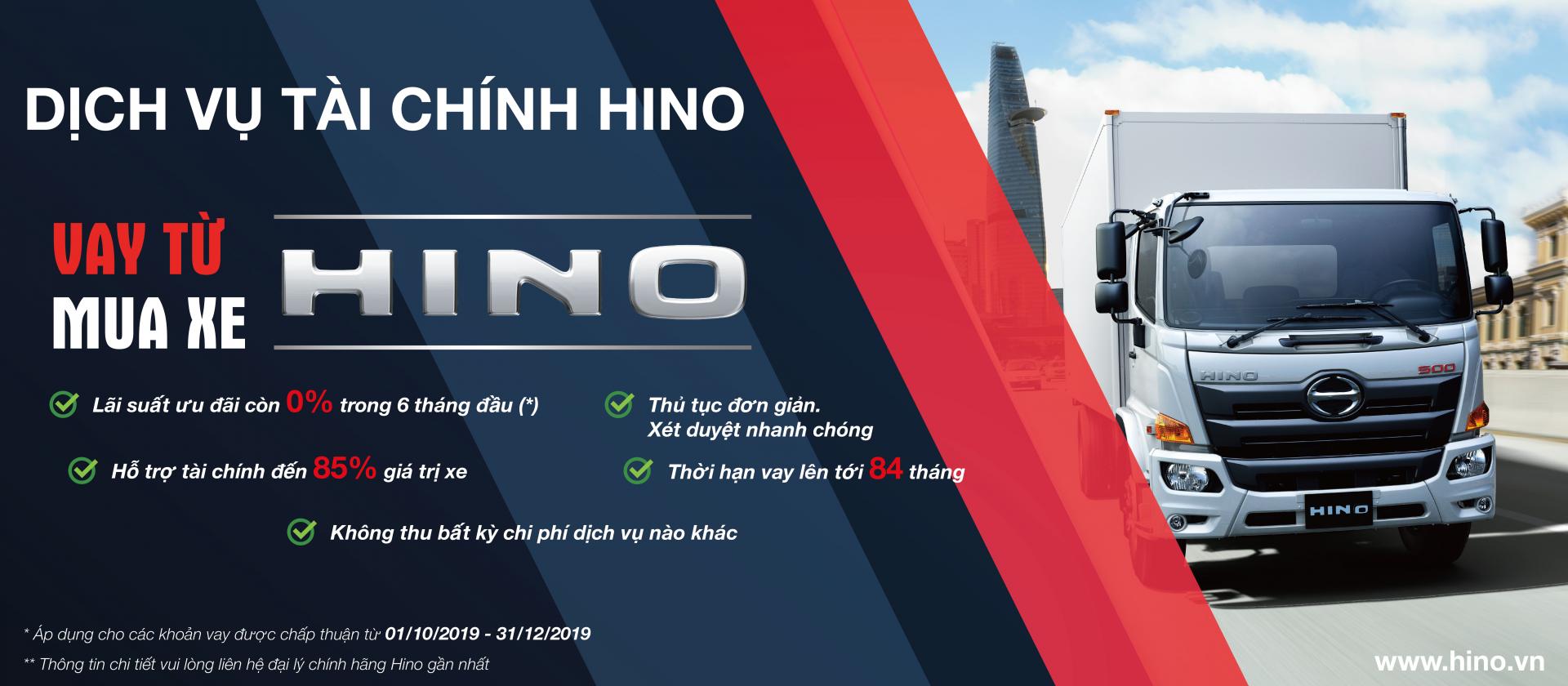 Hino Việt Đăng xin giới thiệu đến quý Khách hàng chương trình dịch vụ tài chính Hino - hỗ trợ khách hàng vay vốn đến 85% giá trị xe, thủ tục rất đơn giản nhanh gọn, thời gian vay lên đến 84 tháng với các gói ưu đãi.